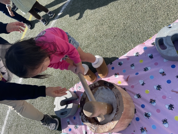 重たい杵を1人で持ったり、初めての体験にとまどいつつも保護者の方と一緒にやる姿がありました。お餅をついたあとは青空のもとで磯辺もちをおいしくいただきました(^o^)