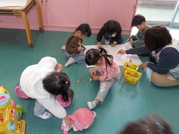 大きな紙にお絵かきをしたり、お友だちと一緒にお医者さんごっこも♪「かーしーてー」「ありがとう」と遊びの中での子ども達のやりが可愛らしく先生達も笑顔でほっこり(*^_^*)